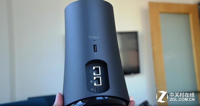 从外观上看,华硕版OnHub更像是TP-Link的OnHub上下颠倒的版本。与TP-Link版本所不同的是,华硕版OnHub底部的指示灯变为三色LED指示灯,并不是环形单色指示灯。而在接口方面,华硕版OnHub同样有1个LAN口、1个WAN口和1个USB接口,只不过其没有像TP-Link版一样,采用隐藏设计(拉起机身外壳才能看到),而是直接设计在了机身上面。