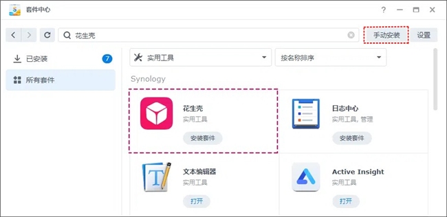 1、 浏览器输入群晖NAS的内网地址,登录后点击【套件中心】,搜索【花生壳】,并点击【安装套件】;