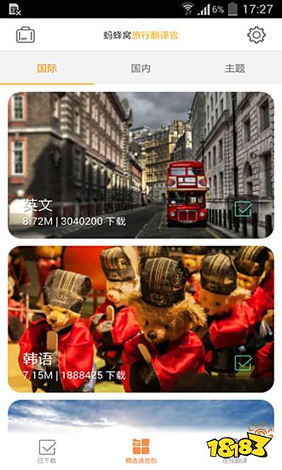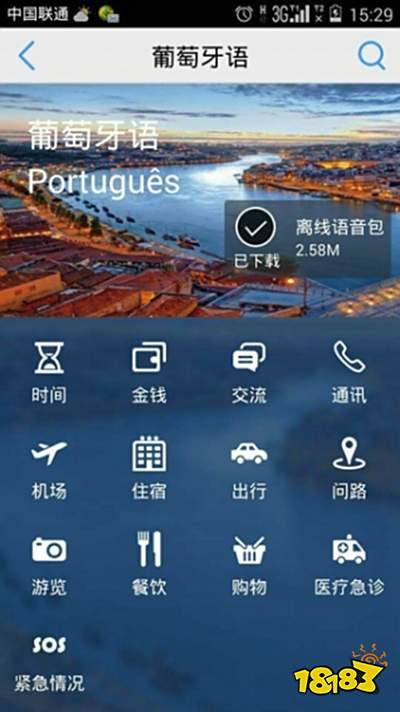旅行翻译官让您的Android设备开口说线多个语种,每个语种根据不同的场景进行分类,如交通、问候、银行、购物、娱乐、餐饮等。