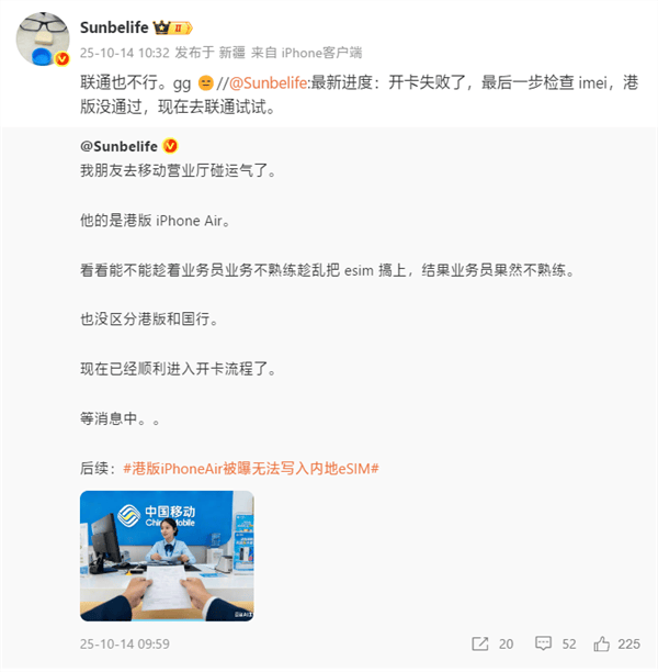 需要注意的是,此前有博主实测港版iPhone Air无法开通三大运营上的eSIM业务,IMEI效验会失败。