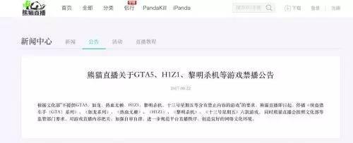 近日,熊猫TV发布公告,根据文化部规定,将禁播《GTA5》、《H1Z1》、《黎明杀机》、《如龙》系列、《十三号星期五》等游戏。目前,熊猫TV上述游戏的分区已经全部下线。而在其他直播平台如斗鱼等,此前仍能看到相关直播,但专区名称也已改为“跳伞专区”,并且大部分主播的房间名称也都改为“最后一次跳伞”。