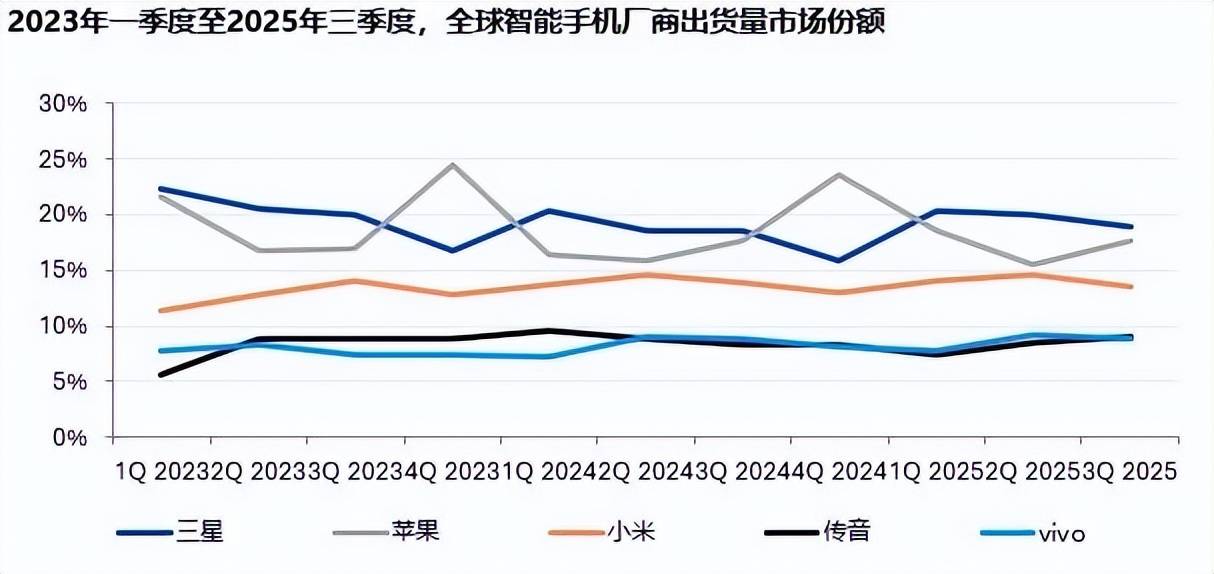 整体看,前三季度总出货9.1亿台,这数字比2024年同期多出点,恢复势头明显。但别光看总量,份额分布才更有意思。三星全年保持第一,Q3份额19%,出货61.4百万台;苹果紧随其后,18.2%份额,58.6百万台;小米13.5%,43.5百万台。