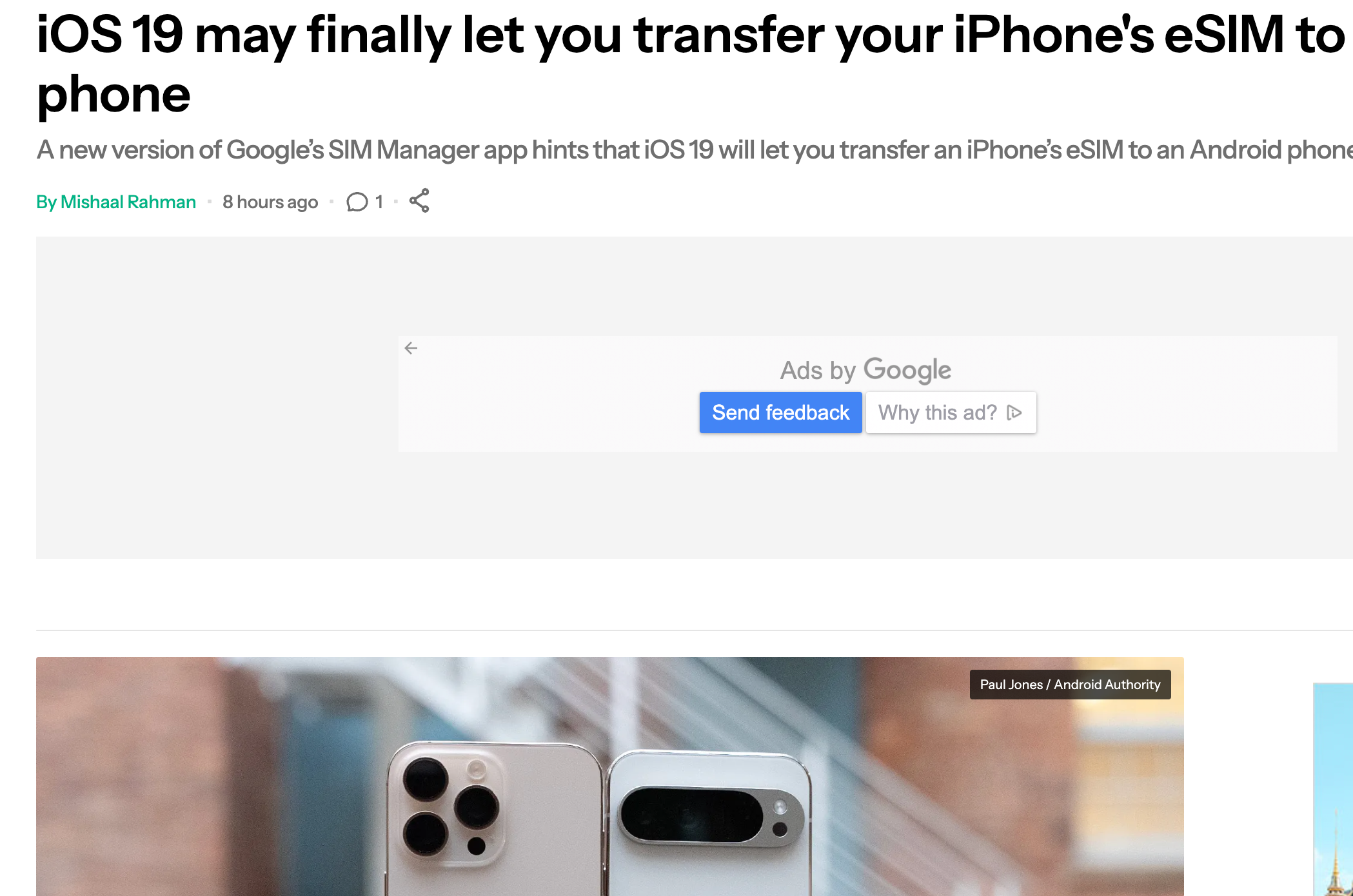 根据Android Authority对安卓16 QPR1 Beta 1更新的代码解析,iOS 19或将在“设置-通用-转移或重置iPhone”中新增“Transfer to Android”选项。用户可通过以下两种方式完成eSIM转移:扫码迁移:安卓设备生成包含加密数据的二维码,iPhone扫描后自动激活;