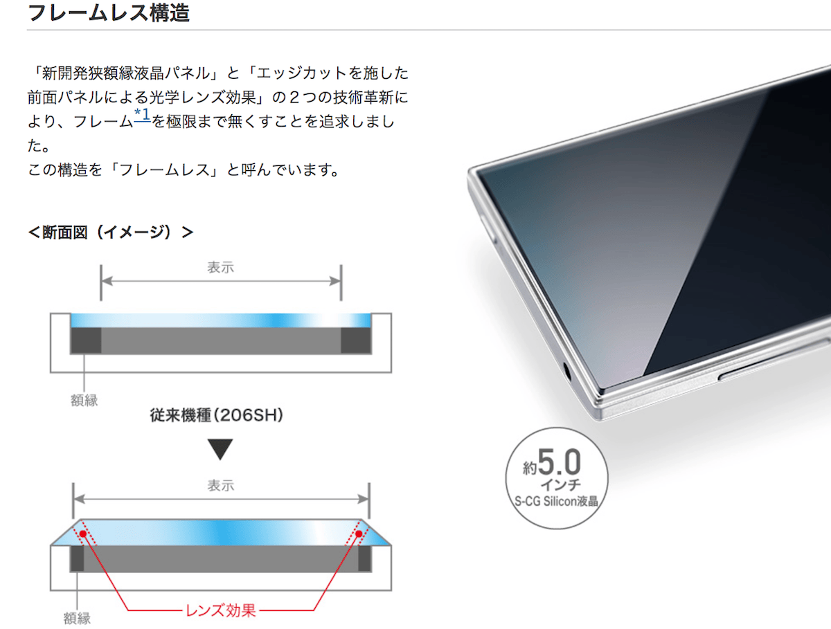 2014 年 8 月,夏普发布了主打「全面屏」的 AQUOS Crystal,其取消了听筒,利用屏幕震动进行传声,同时把前置摄像头等传感器移到了手机下方,从而大大提升了显示面积,屏占比高达 78.5%。此外,还借助特殊的切割技术,对屏幕进行斜面切割,从而让 AQUOS Crystal 的三条边看上去就像消失了一样。