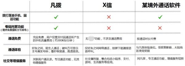 相对于国内流行的网络聊天APP而言,这款凡拨APP不需要添加好友即可拨打电话,可以满足用户与陌生人之间的通话需求。依据上述使用场景,短期境外旅游用户落地取得网络连接后,可以使用常用的聊天软件与国内的亲朋好友报平安,但如预订了其他如接机、租车、酒店等服务,需要与陌生人联系时,可以使用凡拨。这款APP是用户通信方式上的有益补充。