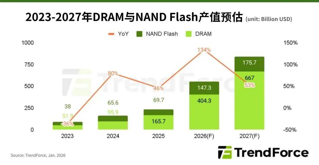 随着北美云端服务供应商在去年下半年加大资本支出、AI 服务器建置加速,2025 年 DRAM 产值已达 1657 亿美元,同比增长 73%。TrendForce 预估,今年 DRAM 年产值将进一步增长至 4043 亿美元,年增率高达 144%。