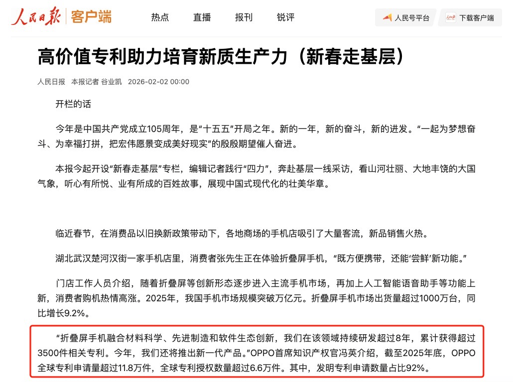 日前,人民日报在2月开篇头版发的《高价值专利助力培育新质生产力(新春走基层)》一文中,重点报道了我国在知识产权与技术创新领域的突破。当中提到了OPPO在折叠屏领域的深耕。