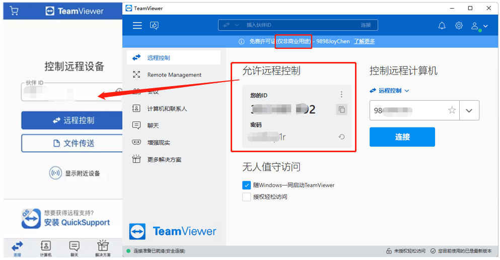 德国老牌远程控制应用,对非商业用途的远程操作是免费的,稳定好用,但不太便于常用。在使用达一定频次或达一定时间后,基本都会被判为商用,禁掉所有权限;收费版价格高昂,普通打工族不如选用无限制的ToDesk。