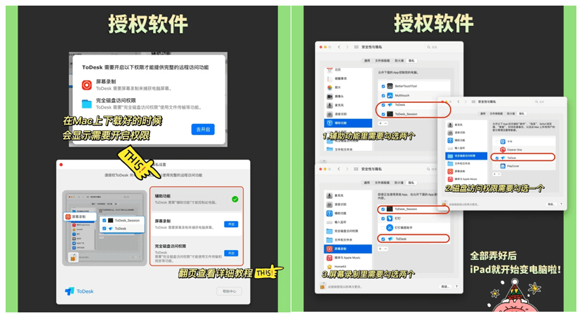 这里需要注意的一点是,因为Mac的安全机制,在装好ToDesk后,需要根据指示步骤开启系统授权。在设置偏好中将【屏幕录制】【辅助功能】【完全磁盘访问权限】这三项的权限统统进行勾选。