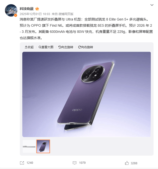 配置方面,Find N6同样拉满:骁龙8 Elite Gen5处理器,8.12英寸2K LTPO内屏,6.62英寸副屏;后置2亿像素潜望长焦+5000万超广角+丹霞原彩镜头;6000mAh电池+80W闪充;重量控制在225g左右;首次支持AI手写笔,进一步提升大屏生产力。