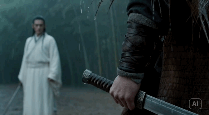 T2V prompt:武侠风格视听大片,竹林里白衣剑客与蓑衣刀客对峙。镜头在两人之间缓慢推移,焦点在雨滴和剑柄之间切换,气氛压抑到极点,只能听见雨声。突然一道惊雷闪过,两人同时冲锋,侧拍镜头极速平移,捕捉泥浆飞溅的脚步。双兵相接瞬间画面切换为极慢动作,清晰展示刀剑震飞雨水形成的圆环激波,以及被剑气切断的竹叶。随后恢复常速两人背对背落地,蓑衣刀客的斗笠裂开,画面戛然而止。