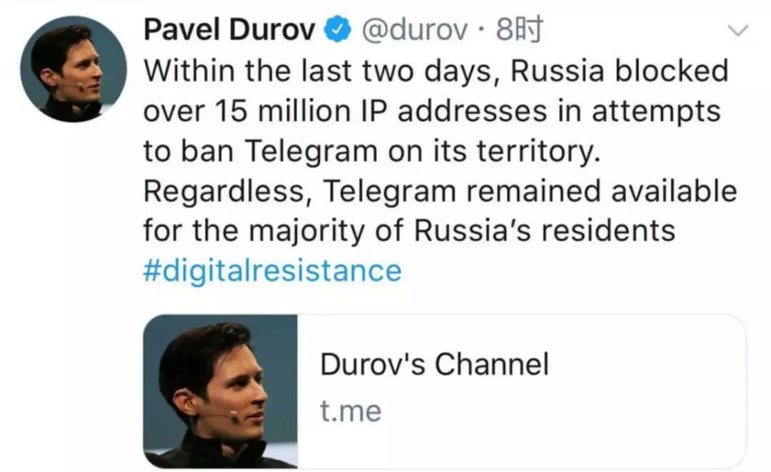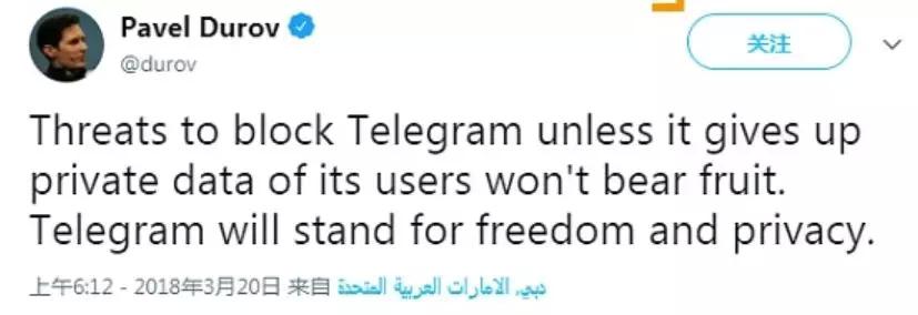 不过 Telegram 老大杜罗夫并没有妥协,3 月 20 号在推特上说封杀的威胁影响不到咱,Telegram 会为自由和隐私战斗。