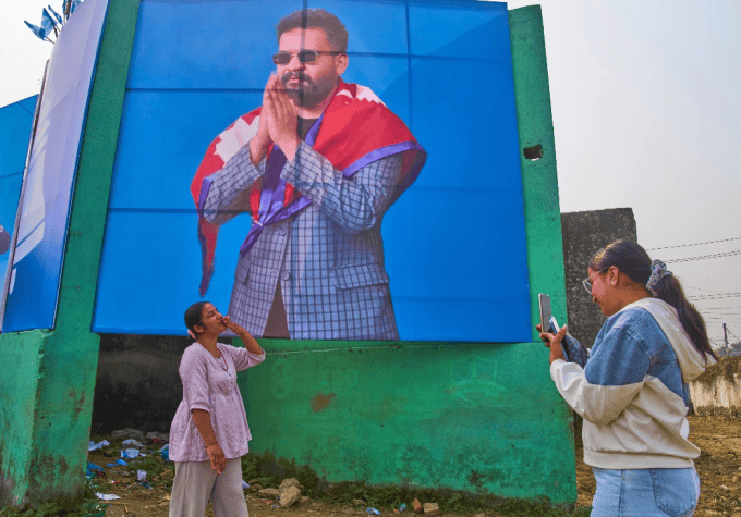 ·2026年2月,在尼泊尔奇特旺(距加德满都以西约180公里)举行的一次竞选集会上,民族独立党支持者在印有沙阿形象的大型海报前为朋友拍照。(美联社)
