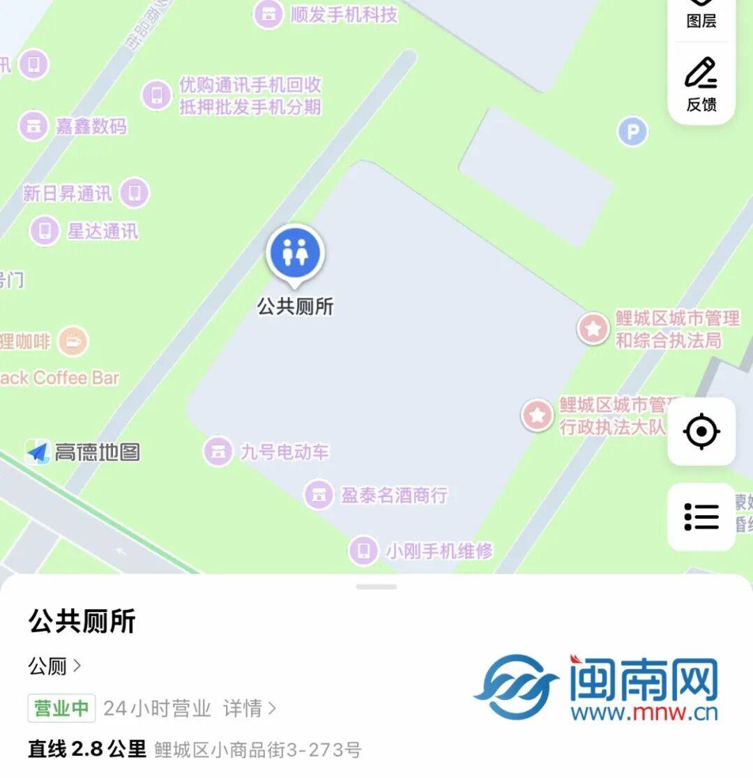 闽南网记者打开导航APP搜索发现,困住甘女士的这座公厕位于鲤城区涂门街小商品街路段,平台上清晰标注着“24小时营业”等信息。