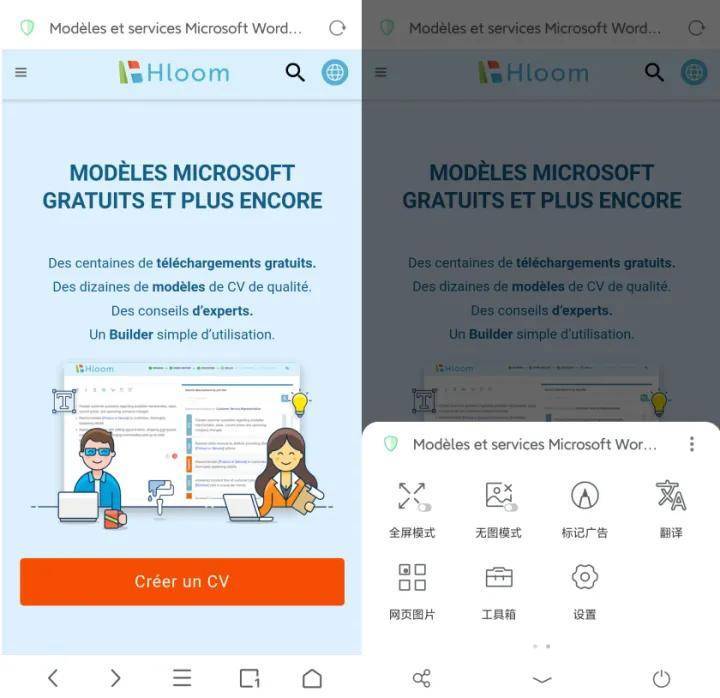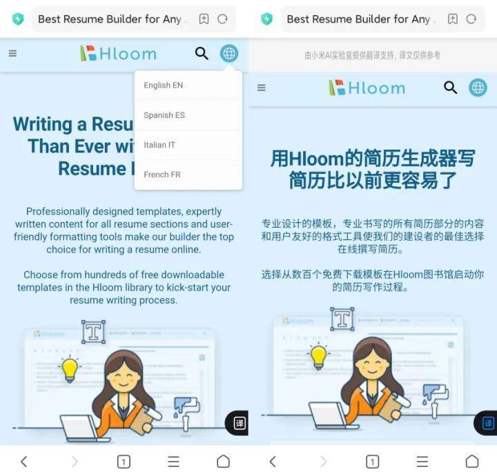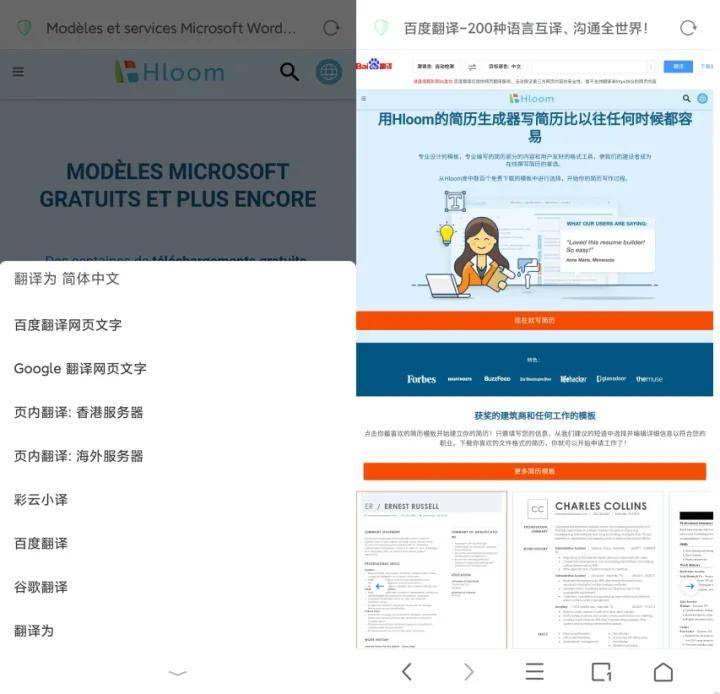 比如预览的国外简历网站,打开后它会自动在页面弹出翻译提醒,点击翻译它会自动将网页翻译成中文,也可以单独点击翻译选择翻译成其他语种,支持翻译的语种包括中文、英文、法语、西班牙语、意大利语5种语言,阅读完成后还支持还原英文网页。