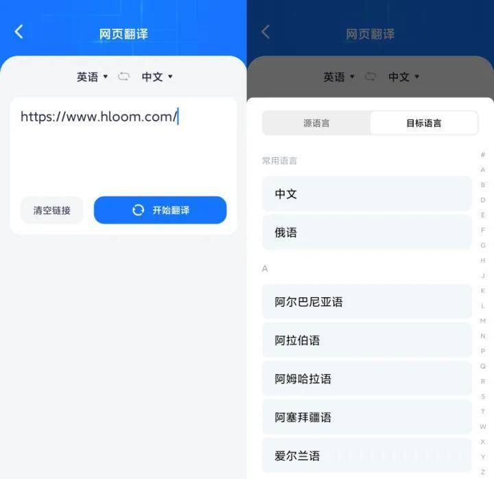 比如翻译浏览器上的国外网页,可以直接用它的“网页翻译”,然后复制国外网址链接,将链接粘贴到翻译框内,接着选择翻译语种,支持翻译的语种非常多。
