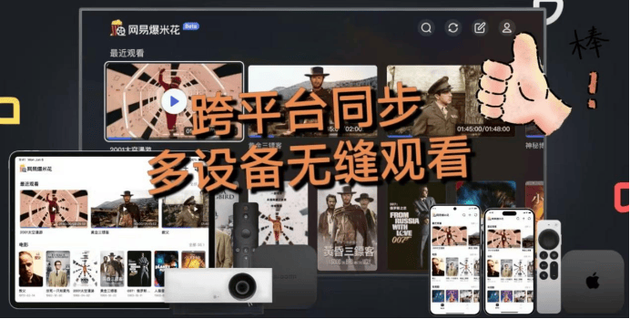 还有啊,网易爆米花支持多设备同步,iPhone、平板、电视无缝切换,让你随时随地都能接着看!再也不用担心出门时没看完的剧,回家还得从头开始了!