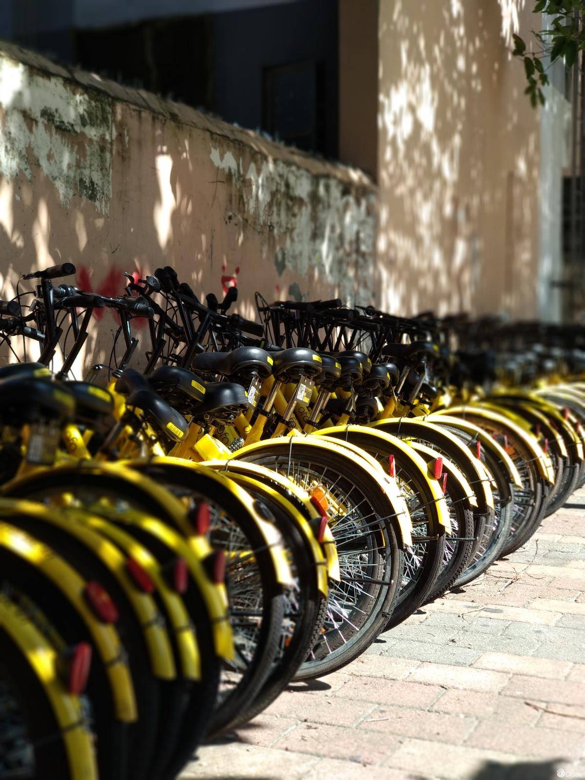 这个场景很美的,第一眼就惊艳到我了。午后的阳光透过稀稀疏疏的树叶在墙壁上形成光斑,下面停靠了一排小黄车(虽然都是坏车),颜色的搭配非常和谐。
