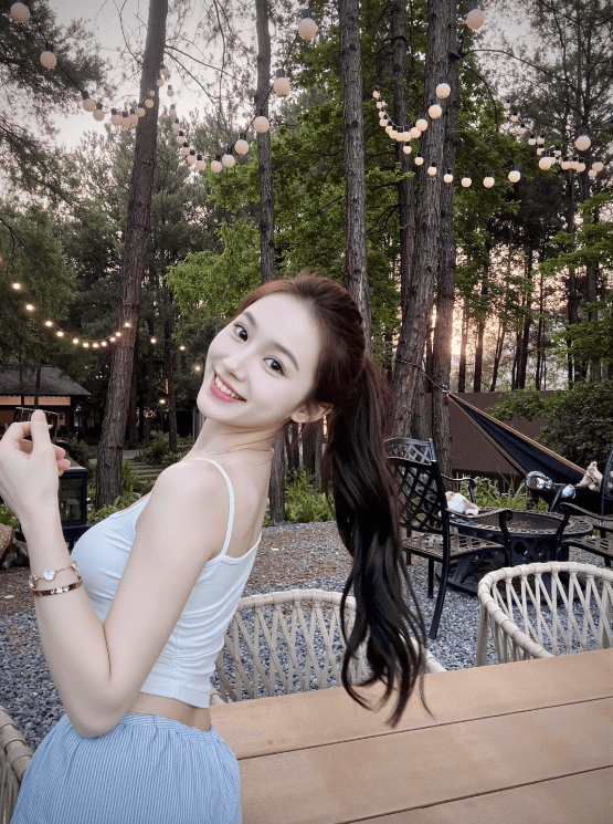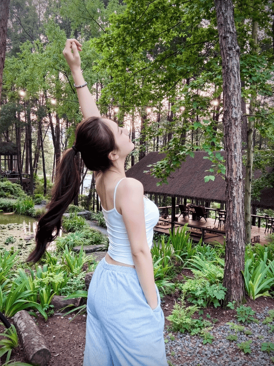 这件白背心很简单,简单到几乎没有多余情绪,可它站在树林、串灯和傍晚光里时,反而特别醒。不是那种要抢镜的醒,是像把身体边缘轻轻擦亮了一圈。白色一旦放在这种暖黄灯和深绿背景里,反差就会自己出来。✔️